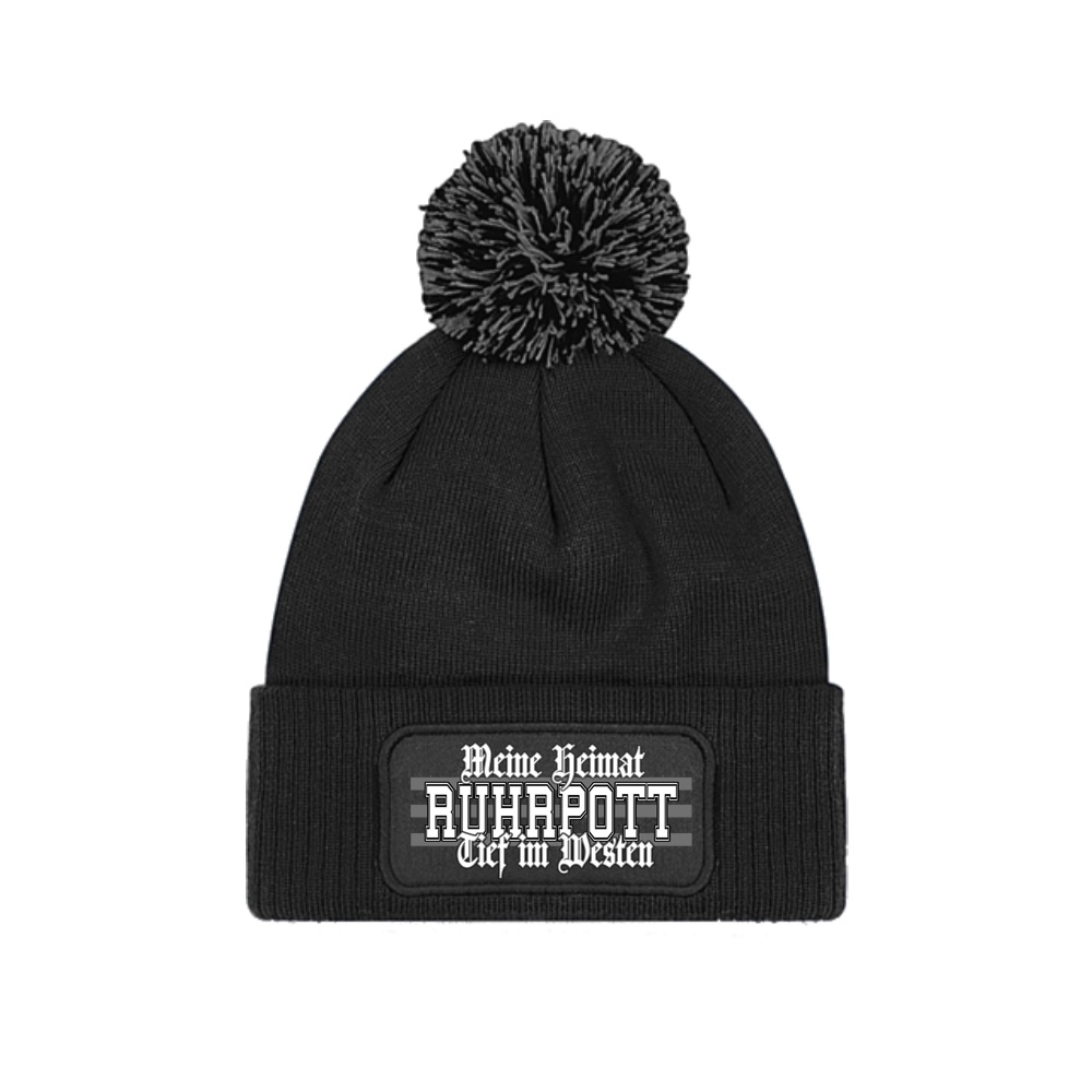 Doppellagige, gestrickte Wollmütze mit zweifarbiger Quaste und Motiv: Ruhrpott Meine Heimat tief im Westen